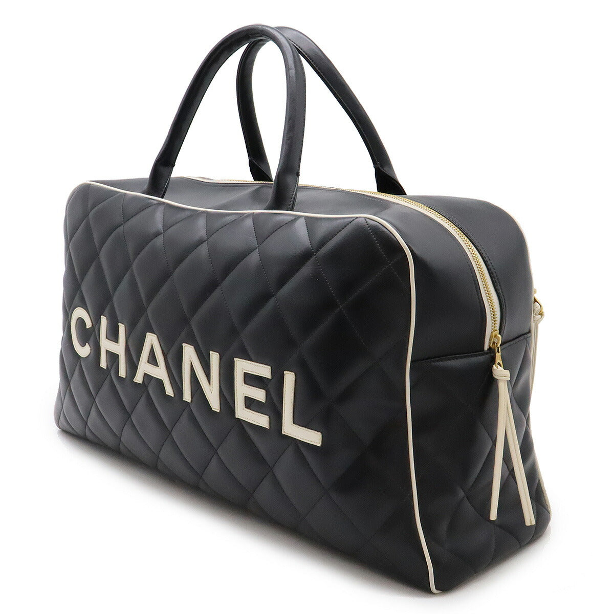 Unleash your inner jet-setter with the Chanel Leather Matelasse Bowling Bag. This Boston Travel Bag is the epitome of chic practicality. The iconic Matelasse stitching and timeless black and white palette exude effortless luxury. Crafted from supple leather, this bag is designed to accompany you on all your adventures, whether it’s a weekend getaway or a stylish trip to the gym. It’s roomy enough to carry your essentials and more, making it the perfect blend of fashion and function for the modern lifestyle. Travel in style and make a statement wherever you go with this iconic Chanel piece.