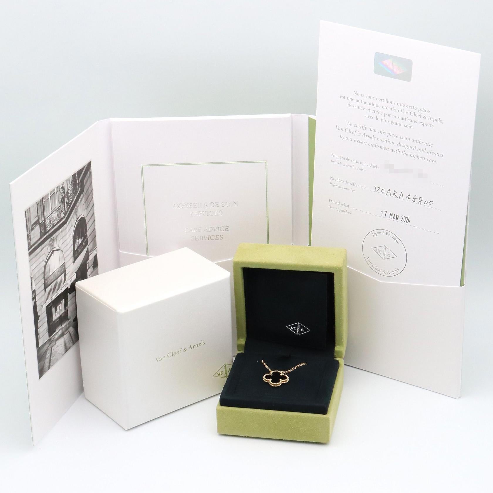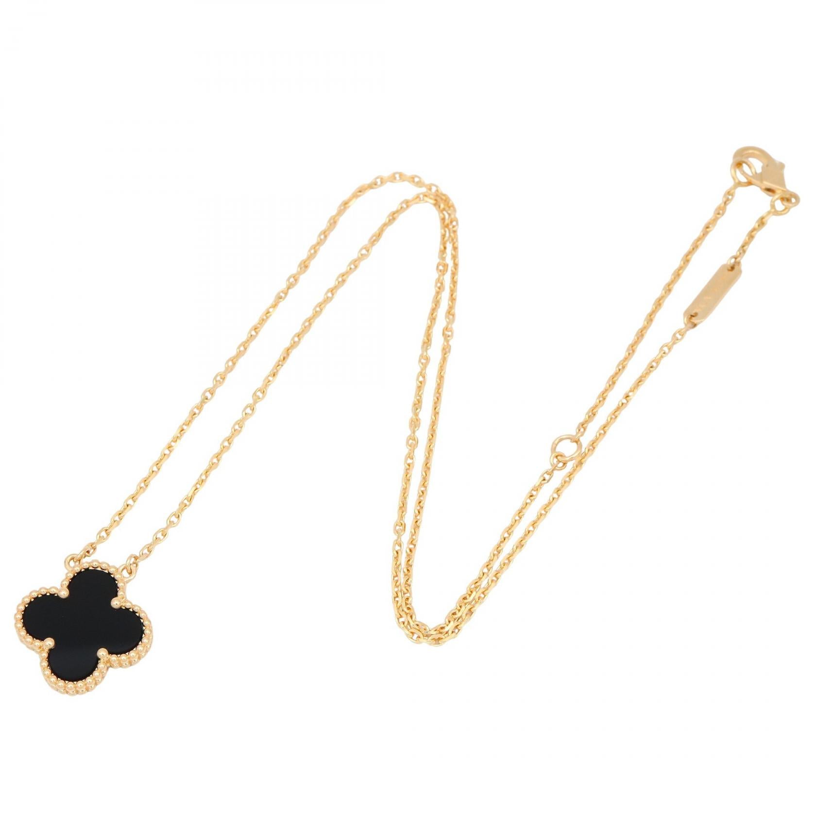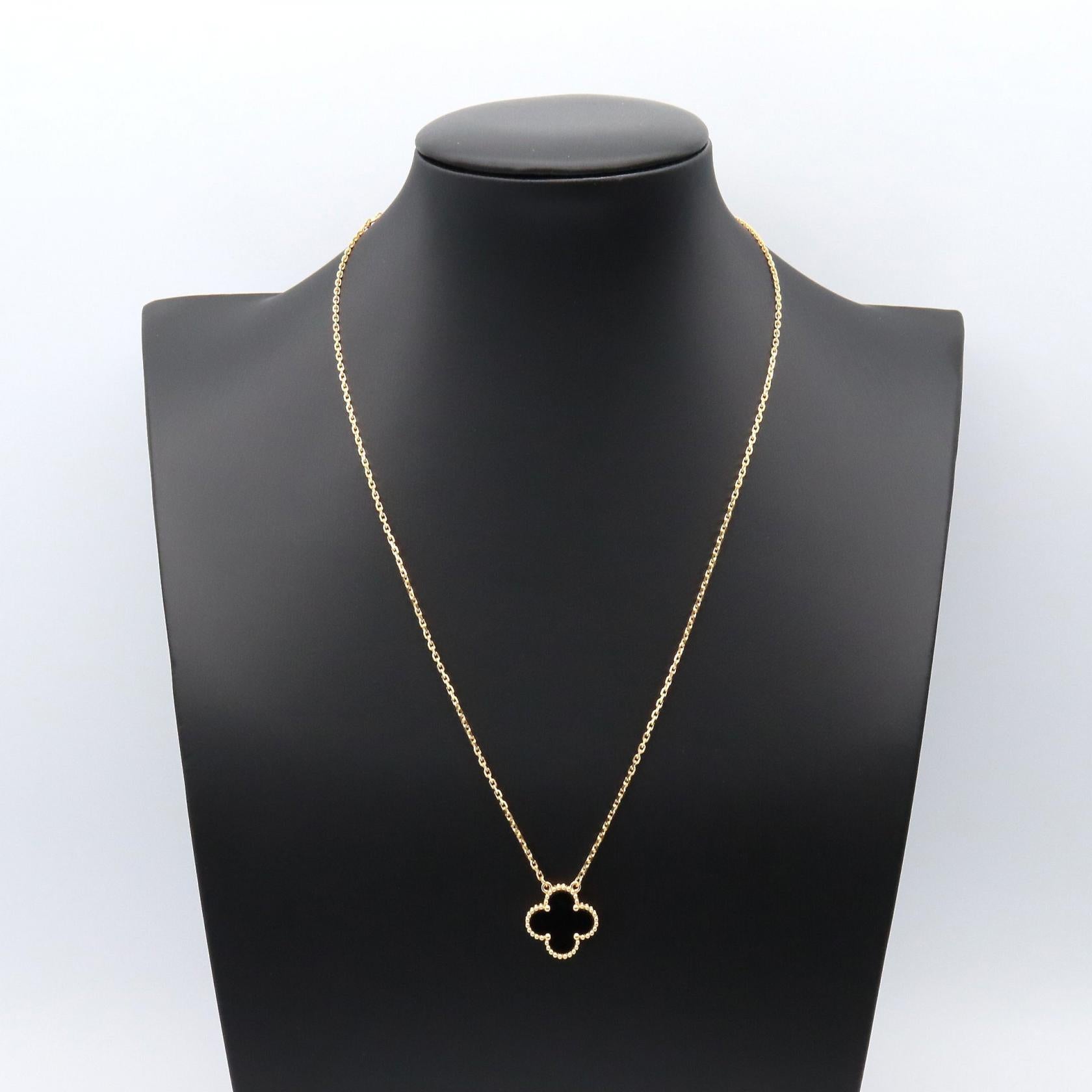 Indulge in timeless elegance with the Van Cleef & Arpels Vintage Alhambra Onyx Necklace. Crafted in Au750 gold, this iconic piece adds a touch of sophistication to your everyday style. Its delicate size makes it perfect for layering or wearing alone, effortlessly elevating any ensemble with its understated luxury. A cherished addition to your jewelry collection.